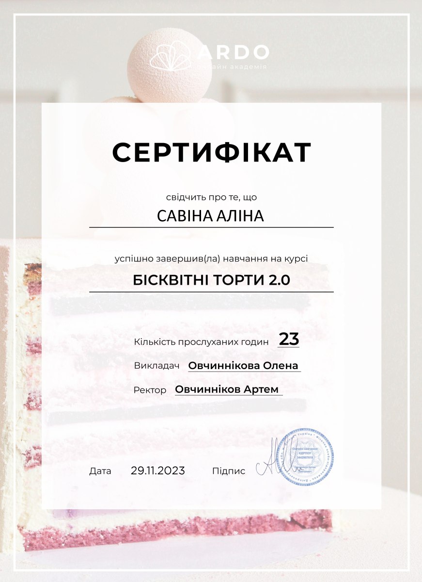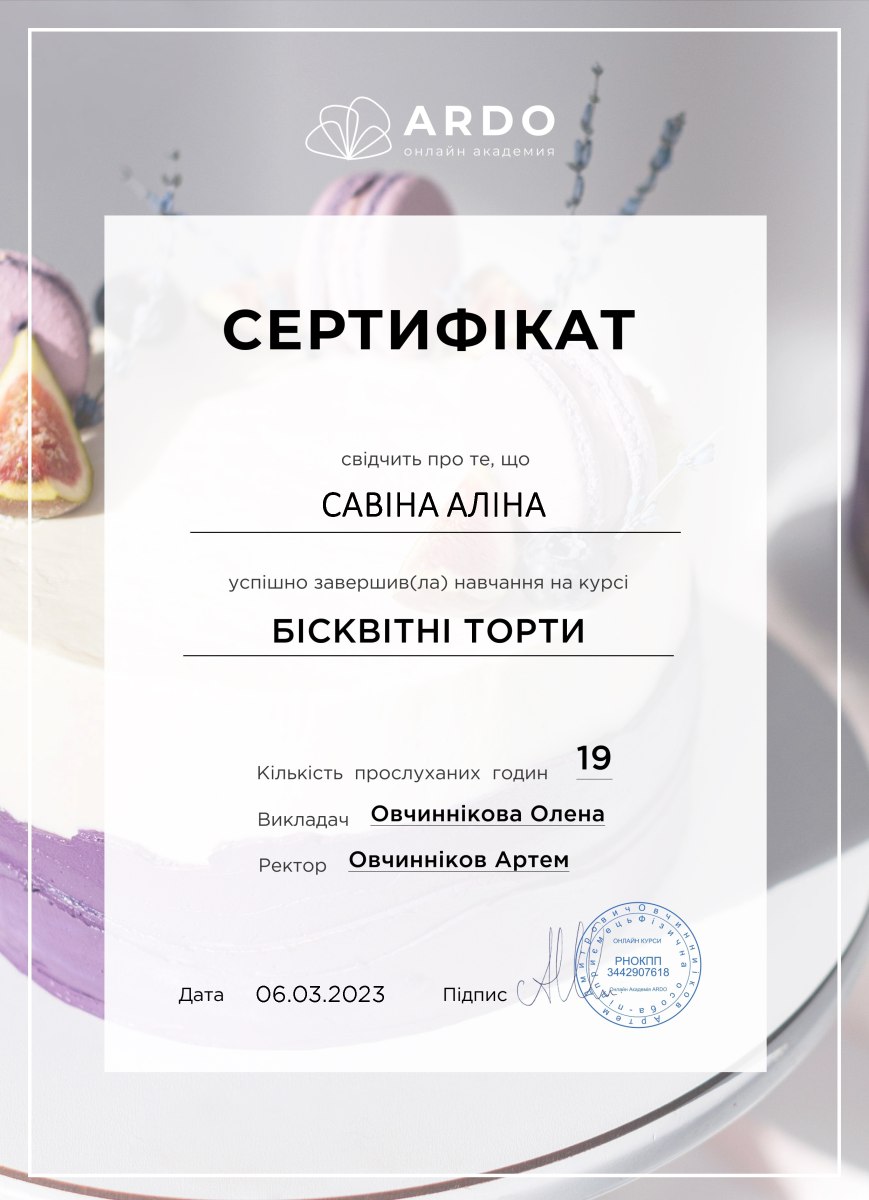 В лютому я почала свій кондитерський шлях і отримала перший свій сертифікат по «Макарон» - це була велика мотивація продовжувати далі . Бісквітний торт з курсу приготувала в березні на день народження свекрухи,я була задоволена результатом,так як різниця між попередніми тортами для рідних була суттєво помітна, а коли ще всім сподобався смак, я зрозуміла, що на правильному шляху!