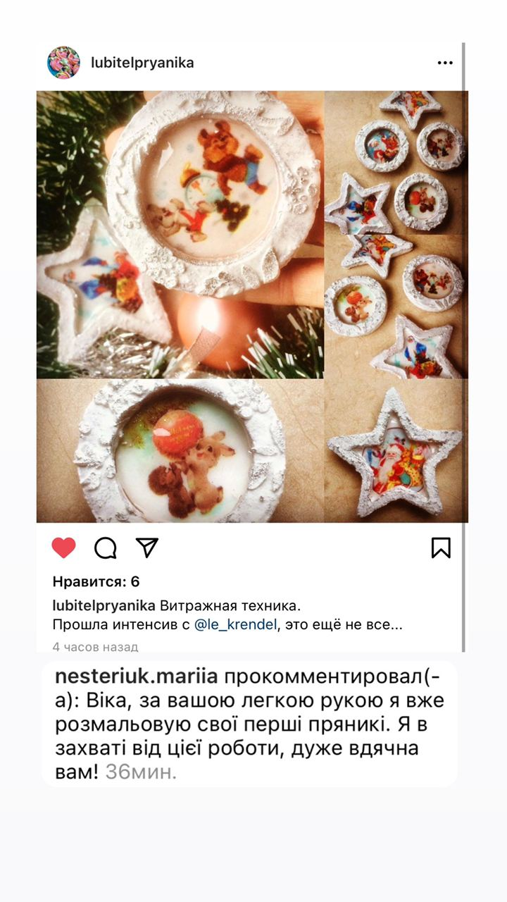 “Я дуже хочу, щоб ваші роботи були найкрасивішими та найвидатнішими! А головне, щоб весь процес приносив Вам задоволення та радість. Тому в моїх онлайн курсах я з любов'ю передаю вам свої напрацювання, робочі рецептури та безцінні техніки“